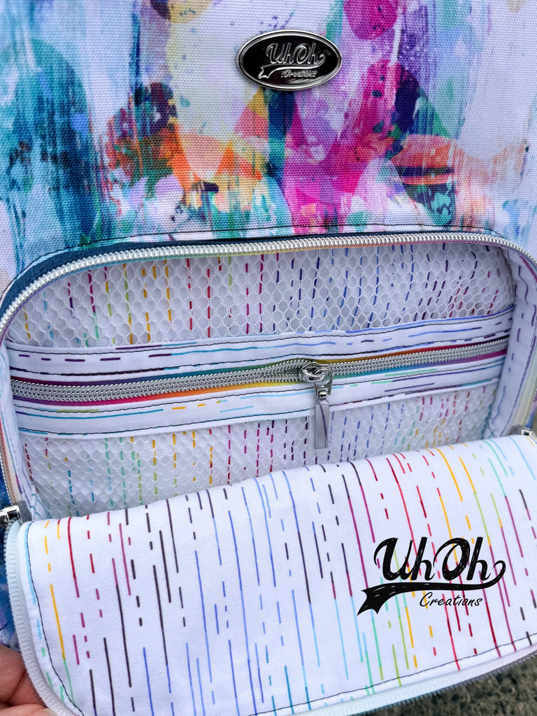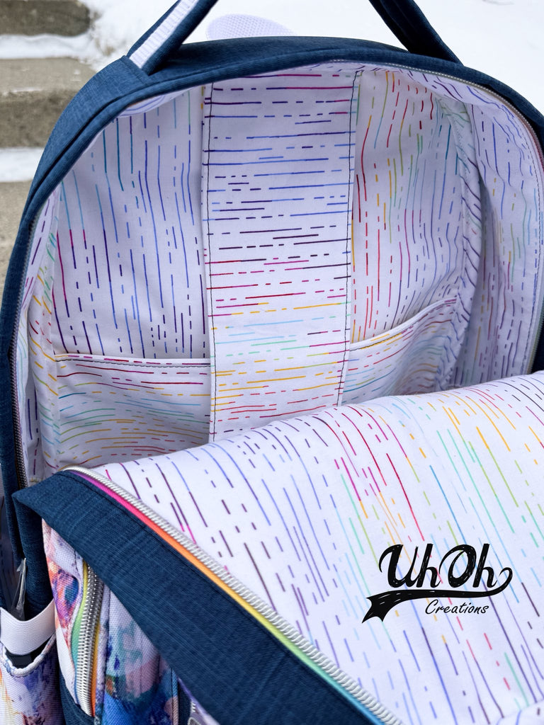 The interior finishes with binding on the final two seams, keeping the lining snug against the body of the bag. There are three tutorials available on the UhOh Creations YouTube channel to help you through the three types of suggested bindings.