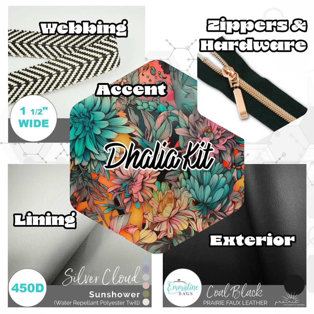 Use the drop down option to view each kit that is available as the colors, prints, and hardware finishes will be different for each. All products used in the kits will be high quality from Emmaline Bags in Spruce Grove, AB - the leading International bag-making source.